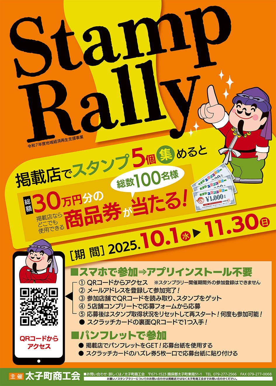 昨今の仕入コストや人件費の上昇で厳しい経営状況を強いられている地元商店や企業を応援しようと、太子町商工会がスタンプラリーを開催している。飲食店はじめ、美容室や日用品店、ユニクロやワークマンといった衣料品店など地元88店舗が参加しており、その中から5店舗分のスタンプを集めて応募すると抽選で100人に参加店舗で利用できる商品券3,000円分が当たる。