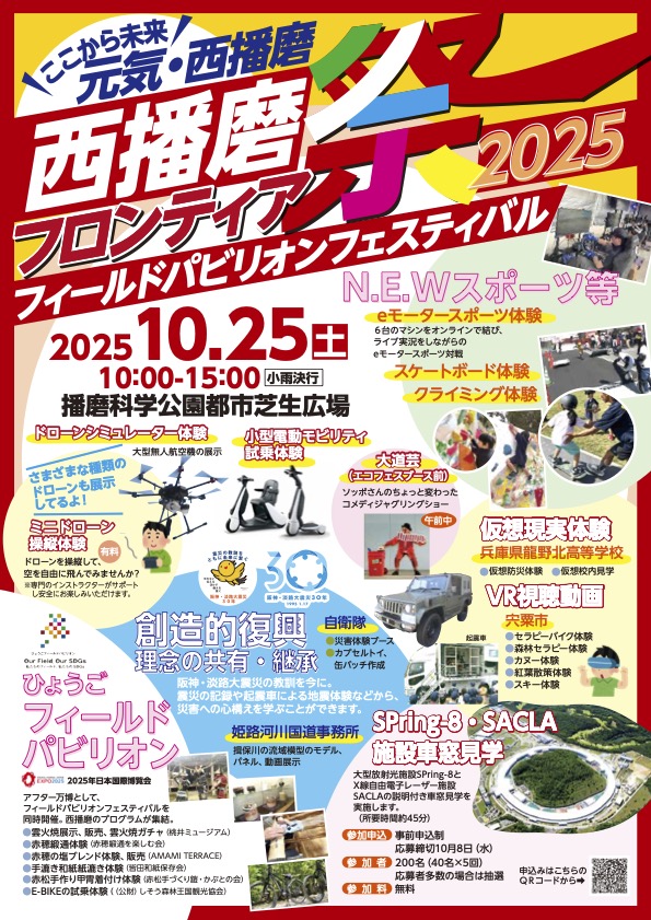 最先端技術を体験しながら西播磨地域の豊かな魅力を存分に感じてもらう秋恒例の「西播磨フロンティア祭」(西播磨県民局主催)が10月25日10時〜15時、播磨科学公園都市(通称=テクノ、上郡町光都)の光都プラザ前の芝生広場で開催される。