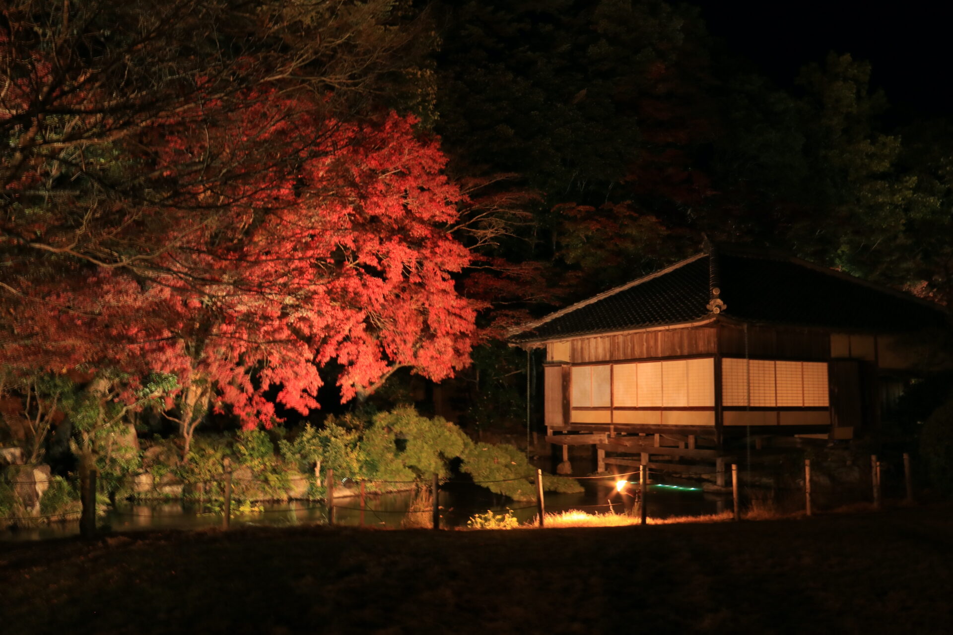 11月21日から12月7日まで開園時間を20時まで延長し、日暮れとともに園内の木々をライトアップ。照らされた紅葉が池に映り、幽玄の世界を醸し出す。レストラン「活水軒」では19時半まで夜間特別営業(ラストオーダーは19時)。1日限定20食の特別メニュー「薩摩豚のしゃぶしゃぶ御膳」も提供する(2980円、3日前までに要予約)。一般310円、小中高校生150円。好古園(電話079-289-4120)