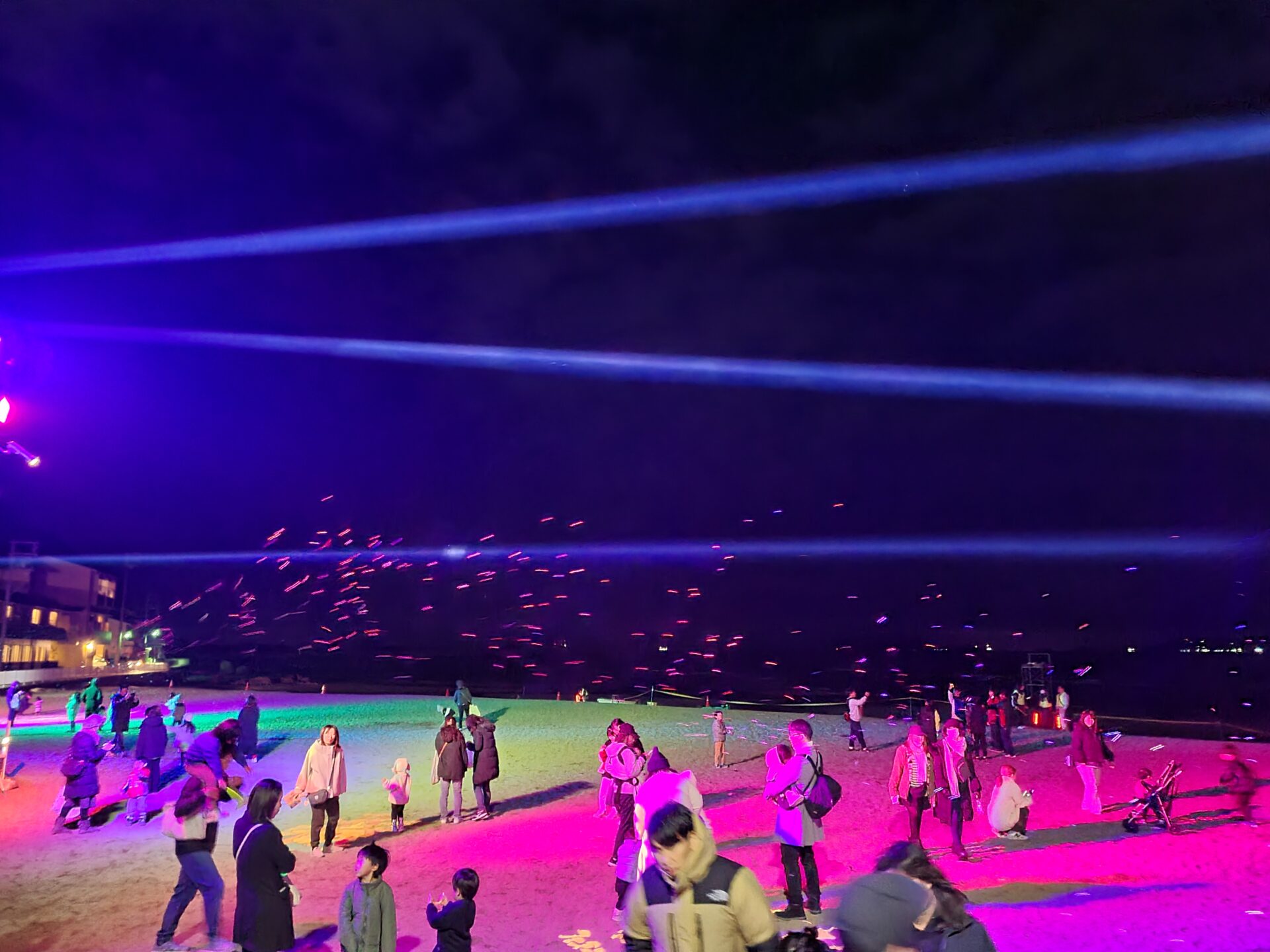 色とりどりに照らされた中央浜と海岸沿いでシャボン玉が舞い、福ヶ浜でプロジェクションマッピングを投影、中央松林では御津小6年生児童が制作した竹あかり31個を灯し、冬の新舞子浜を幻想的な雰囲気に包み込む。