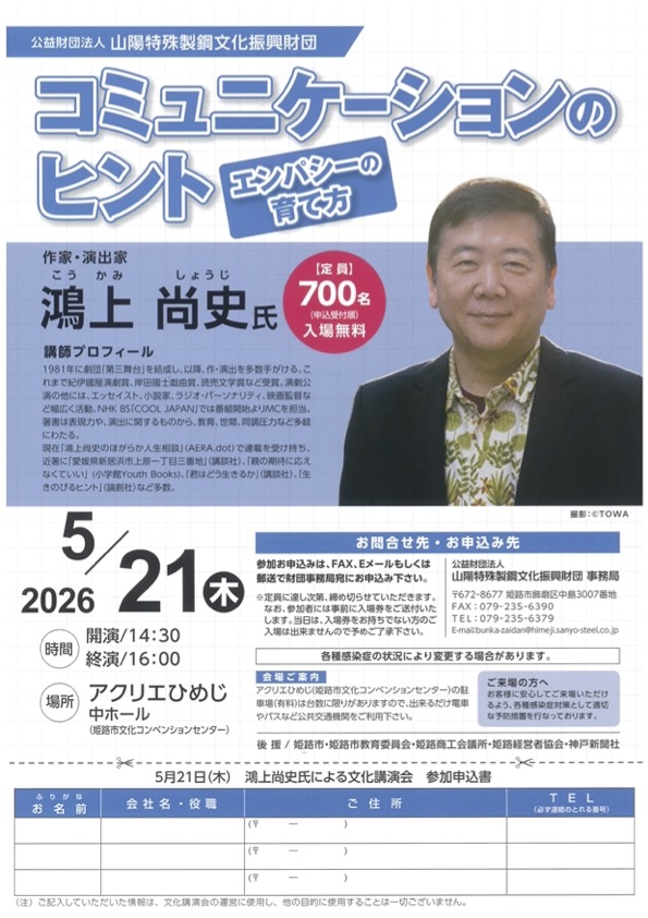 聴講無料、先着700人。氏名、住所、電話番号を書いて同財団へEメール(bunka-zaidan@himeji.sanyo-steel.co.jp)かFAX(079-235-6390)で申し込む。<2026/03/16>
